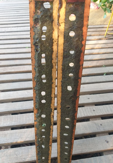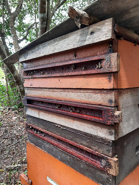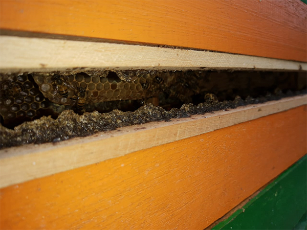 Note the homogeneous gap filling, indicating plenty of food and little to none variation in raw material´s availability. Since the gaps are filled from the border to the inside, and the process takes around 8 to 17 days, appearance can vary due to weather changes and plant´s seasons. If it takes too long to cover it, it indicates that there is not enough sap/resin available in the hive´s vicinity, and quality decreases; the borders, where they started covering, becomes brittle. There is a timeframe to be observed for gap covering, it can´t be longer than 17, 18 days. The holes left are where the bees enter the colony.